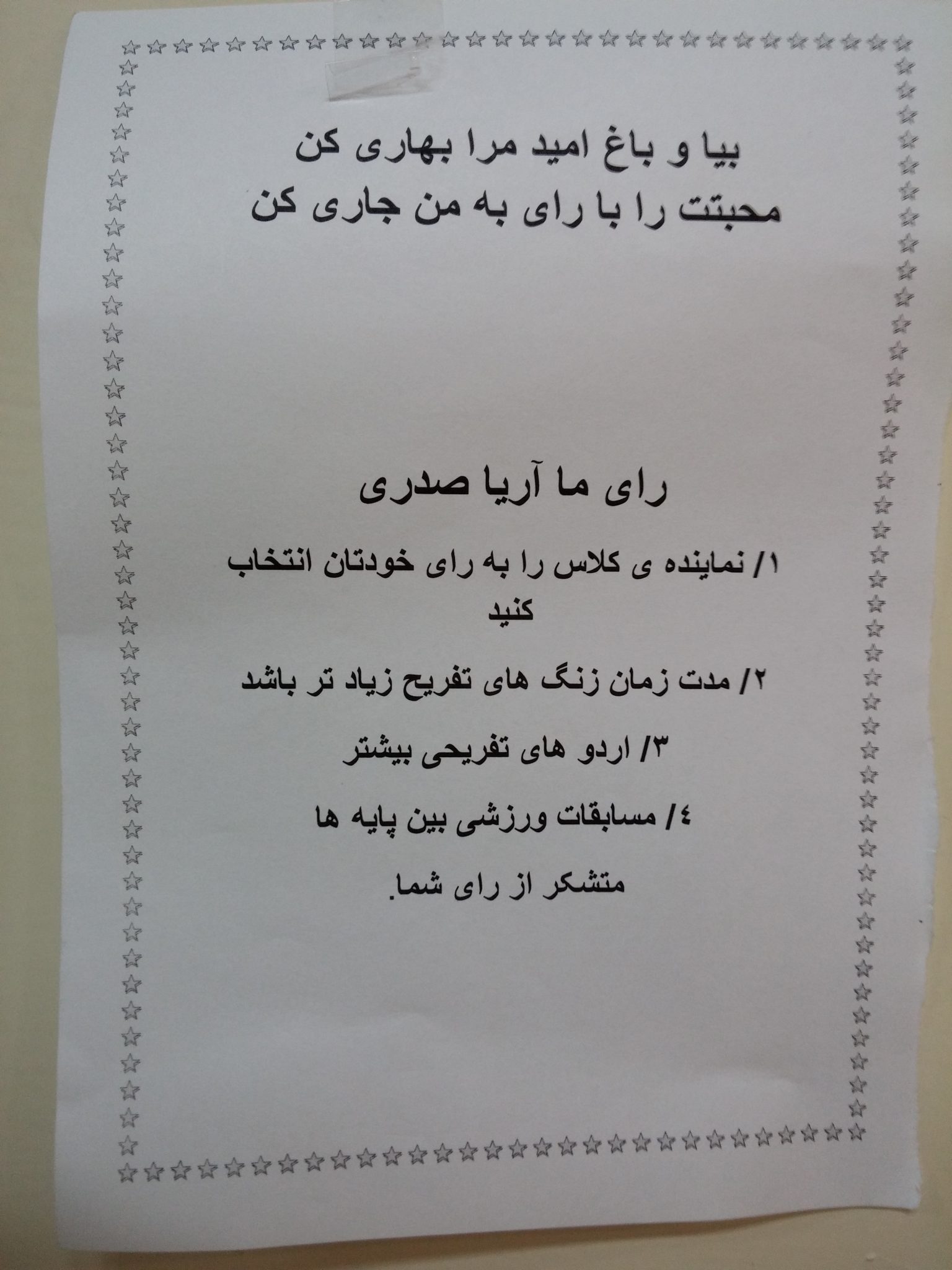 قرارمون بر این بود که هر دانش آموز موقع انتخابات به چهار تا از دوستاش که اسم هاشون بالا هست رأی بده.
