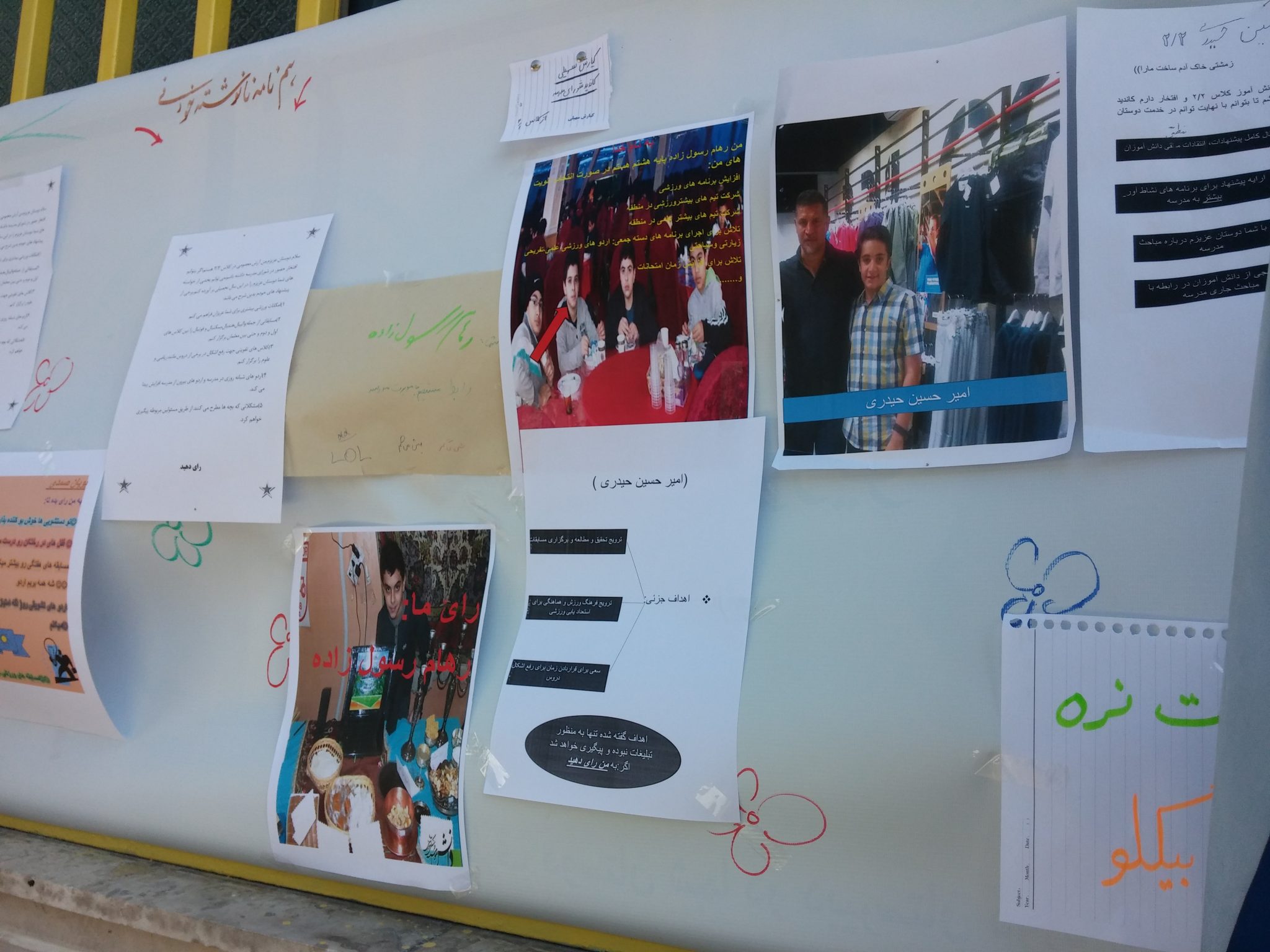 تبلیغات این کاندیدا ها یه هفته پر شور و هیجان بود و همه جای مدرسه و رو در دیوار ها پر از تبلیغ بود. از تبلیغات کتبی و عکسای سلفی گرفته تا تبلیغات شفاهی و دهن به دهن…