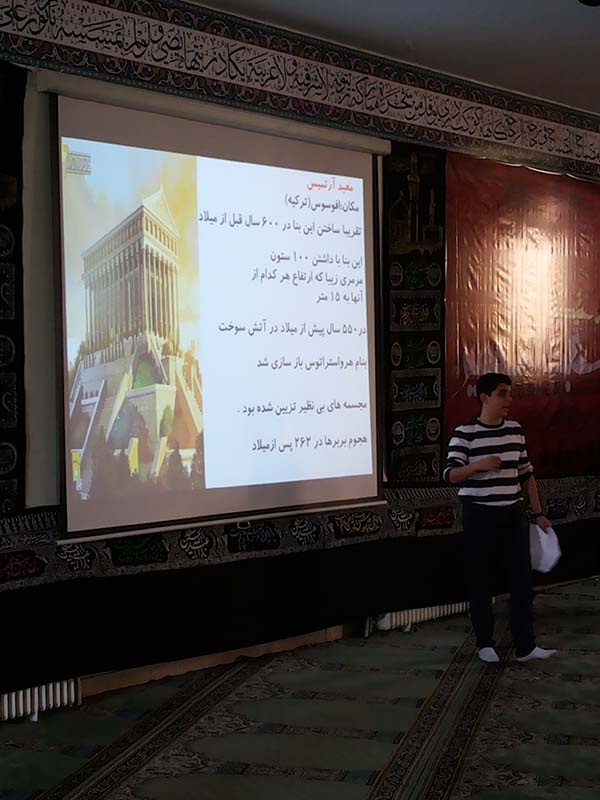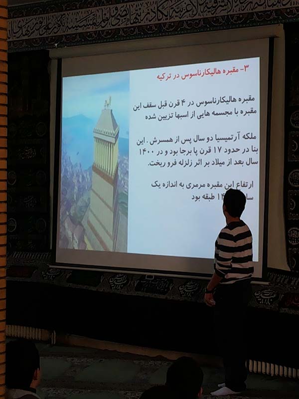 روز شنبه ۳۰ آبان در زنگ ظهر و برنامه فرهنگی پایه سوم که در نمازخانه برگزار شد نوبت کلاس ۳/۱ بود که موضوعی را ارائه بدهند و درباره ی آن صحبت کنند که از کلاس مذکور دونفر به نمایندگی موضوع عجایب هفت گانه را انتخاب کرده بودند و درباره آن پاورپوینت و مقاله آماده کرده و به دوستان خود توضیح دادند که بحث بسیار جالب و تازه ای بود و بسیار خوب اجرا شد.سپس آقای زمانی هم در مورد این موضوع صحبت های تکمیلی را کردند و جلسه به پایان رسید.